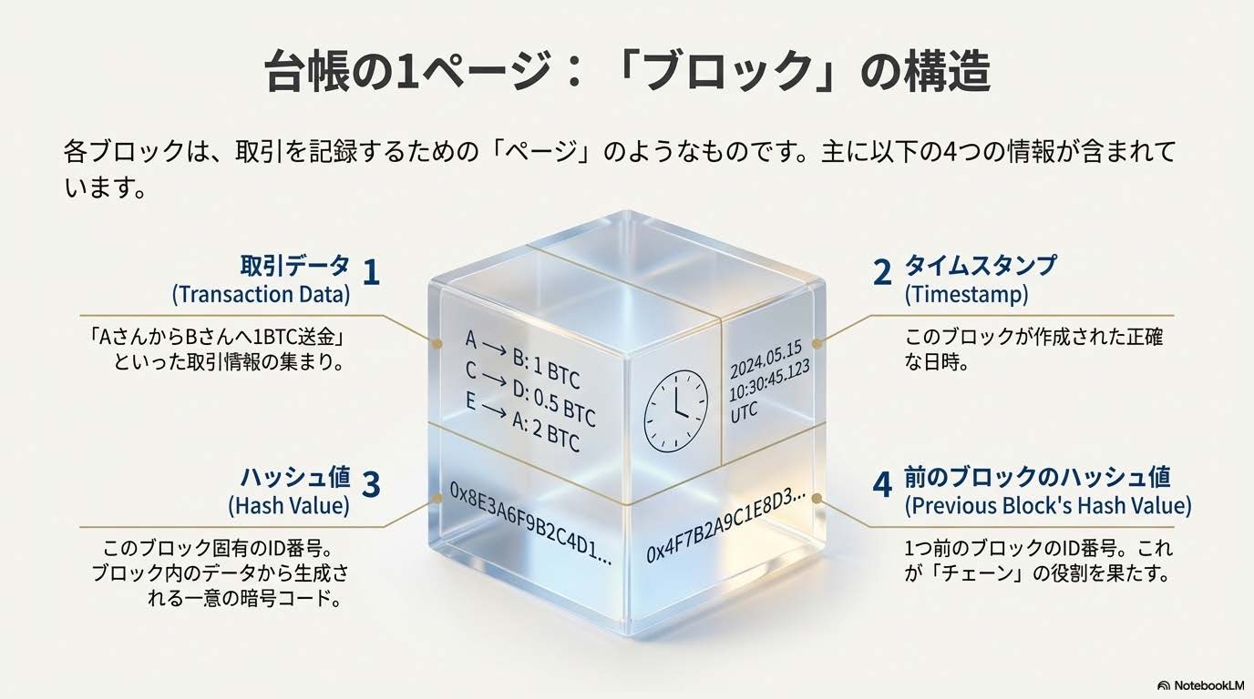 ブロックチェーンは、取引記録が書かれた「帳簿」が世界中のコンピュータに分散して保存されているようなものです。全員が同じ帳簿を持っているため、不正な改ざんがあればすぐに検出できます。