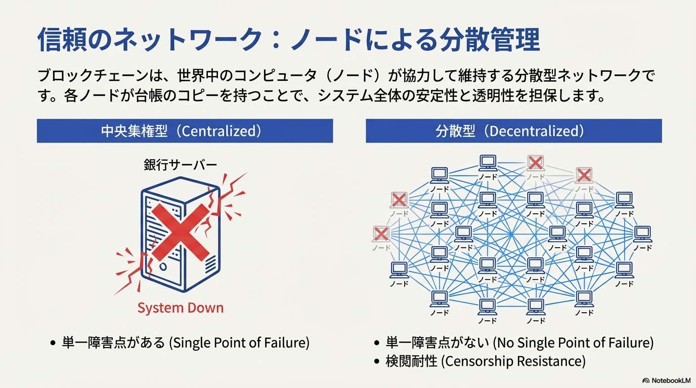 一方、仮想通貨は分散型です。世界中の多数のコンピュータ(ノード)が協力してネットワークを維持し、全員が同じ取引記録を持っています。
