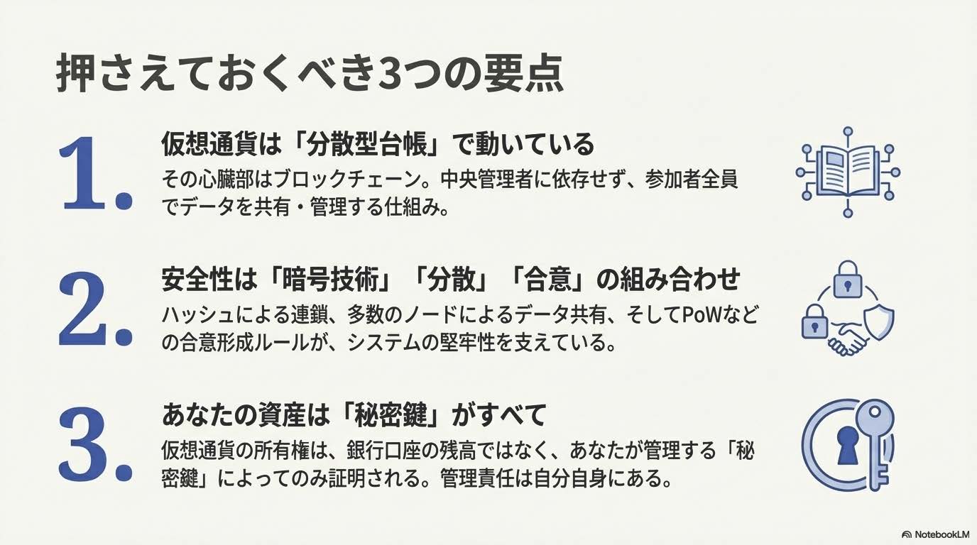 仮想通貨の仕組みについて解説してきました。最後に、この記事のポイントを整理します。