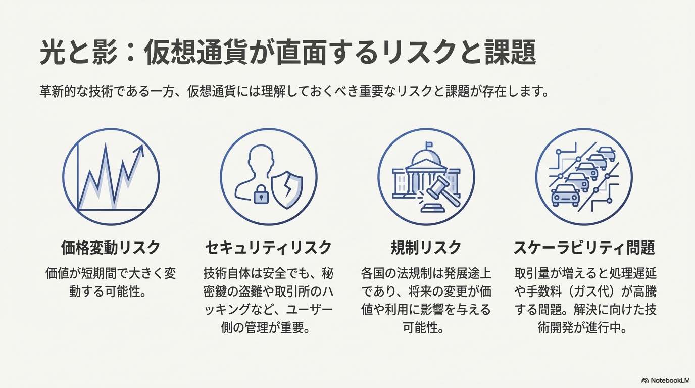 環境問題、規制対応、セキュリティなど、仮想通貨には多くの課題があります。これらの課題を着実に解決しながら、技術と社会の両面で健全に発展していくことが期待されています。
