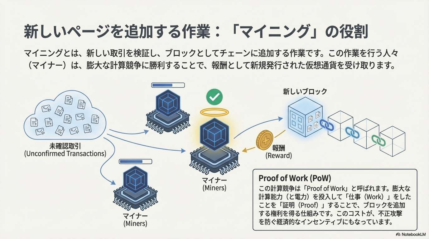 • マイニングは新しいブロックを作成し、報酬として仮想通貨を得る作業